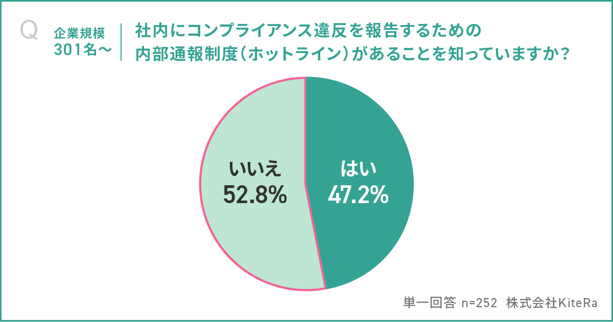2022年6月に改正された公益通報者保護法により、内部通報制度の整備が義務付けられている従業員301名以上の企業に所属する従業員の回答を見ると、「いいえ」が52.8%、「はい」が47.2%という結果となり、内部通報制度の認知度に課題があることが明らかになった。