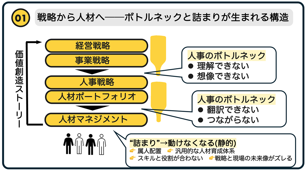 とはいえ、「事業戦略が曖昧だから、人事戦略を練られないんだ」とか「トップダウンで話が降りて来ないから、人事で何をすればよいか分からないんだ」などという言い訳は通用しないと考えたほうがよい。当然、常日頃から足元の状況や事業戦略は把握しておくべきだし、現場のキーマンや経営層がポロッと漏らす“0次情報”を集めておくべき。それらの情報を人事内で持ち寄って、これから自社が向かっていく未来に想いを馳せて仮説を立てていくくらいの気概も大切です。
