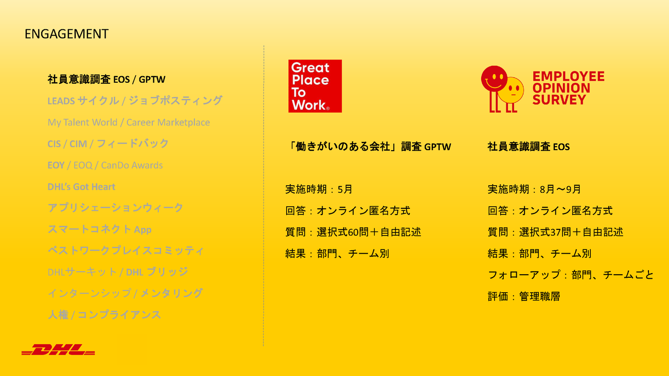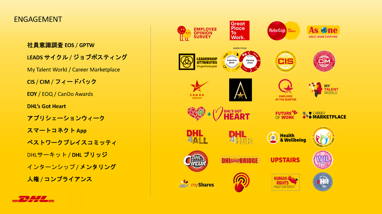 そうしたDHLの「やる気のある人材」に対する取り組みの中で、最も重視されているのが、「エンゲージメント」の向上だ。たとえば、オープンなコミュニケーション、フィードバック、情報共有、多様性の重視、チームワーク、前向きな姿勢の尊重、チャレンジする機会の提供、コンプライアンスの重視、安心安全な職場づくりなどが該当し、さまざまな施策がいずれも前述の「4つの柱」に紐づいて策定されている。