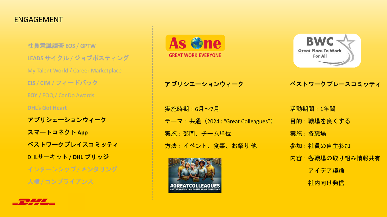 大植氏は「DHLでは、『社員を大切にすることは、お客様を大切にすることにつながる』という考え方を重視している。グローバルなネットワークでサービスを提供する当社にとって、顧客への誠実な対応は、チーム全体が互いに尊重し、協力し合いながら『As One』の姿勢で成果を出すことに直結している」と語る。つまり、社員のエンゲージメントは、「お客様への取り組み」と「社員同士のチームワーク」の両面を意識したものである必要がある。