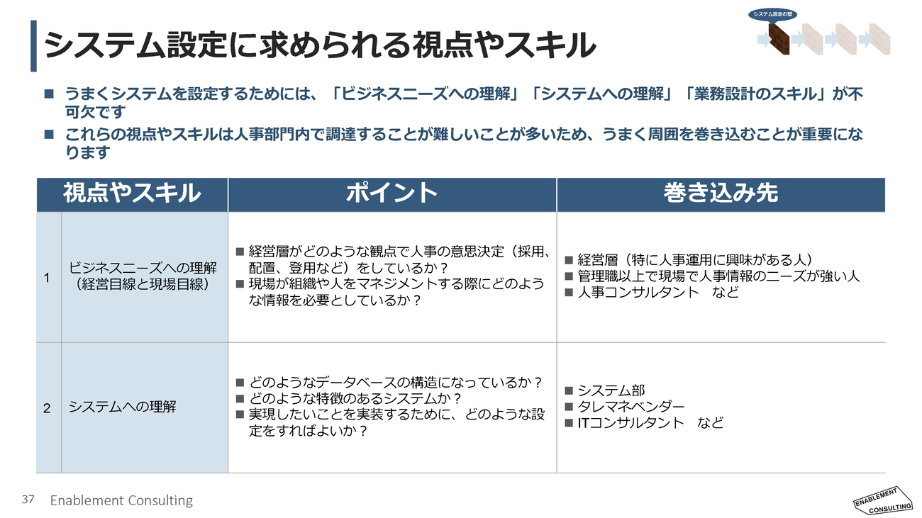 まず、システム設計の壁とは「やりたいことをやるために、どのようにシステムを設定すればよいか分からない」というケースだ。この場合、人事部のみで必要なケイパビリティの獲得が難しいケースが多いため、現場と「タッグ」を組んで対応することを勧めているという。システム設定に求められる視点やスキルとしては、やりたいことの解像度とやり方の解像度が非常に重要となる。前者はビジネスニーズへの理解、後者はシステムへの理解と言い換えられる。