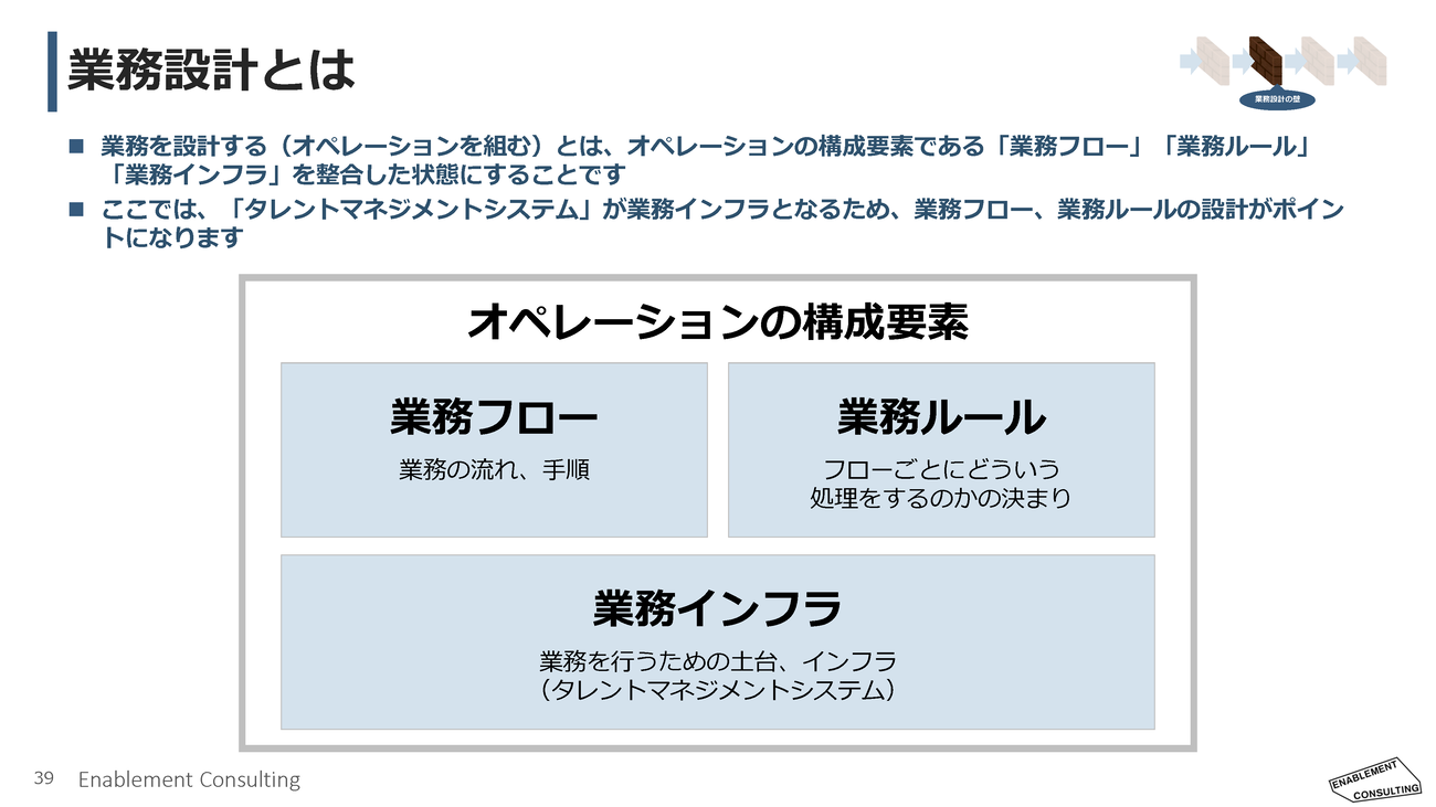 次に、業務設計の壁とは「システムを導入して利用環境の構築は完了したが、継続的な運用ができていない」というケースだ。そこは、「運用Excelの活用」と「業務フロー、業務ルールの組み立て」で対応することになる。そもそも業務設計とは、オペレーションの構成要素である「業務フロー」「業務ルール」「業務インフラ」を整合した状態にすることを意味する。「業務インフラ」がタレントマネジメントシステムそのものとなるため、ここでは「業務フロー」「業務ルール」を固めることがポイントとなる。しかも、その際にはシステム間の流れを整理しておく必要があるという。