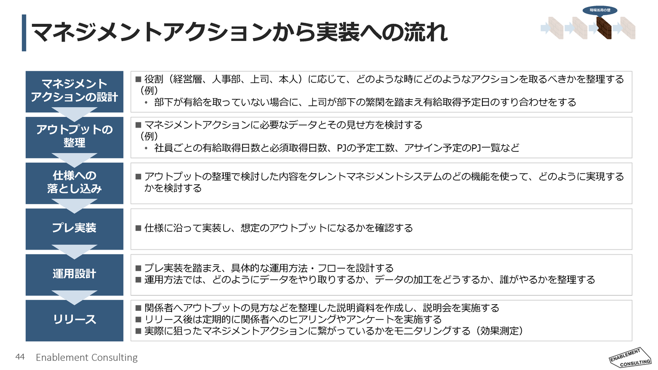 マネジメントアクションとは、役割に応じて、どのようなときにどのようなアクションを取るべきかを整理することを指す。そのために必要なデータを集め、システムに実装・運用設計しリリースしていく。この流れを活用すれば、組織別、メンバー別の変化をダッシュボードで把握し、スコアが下がっている社員の詳細を確認することも可能となる。