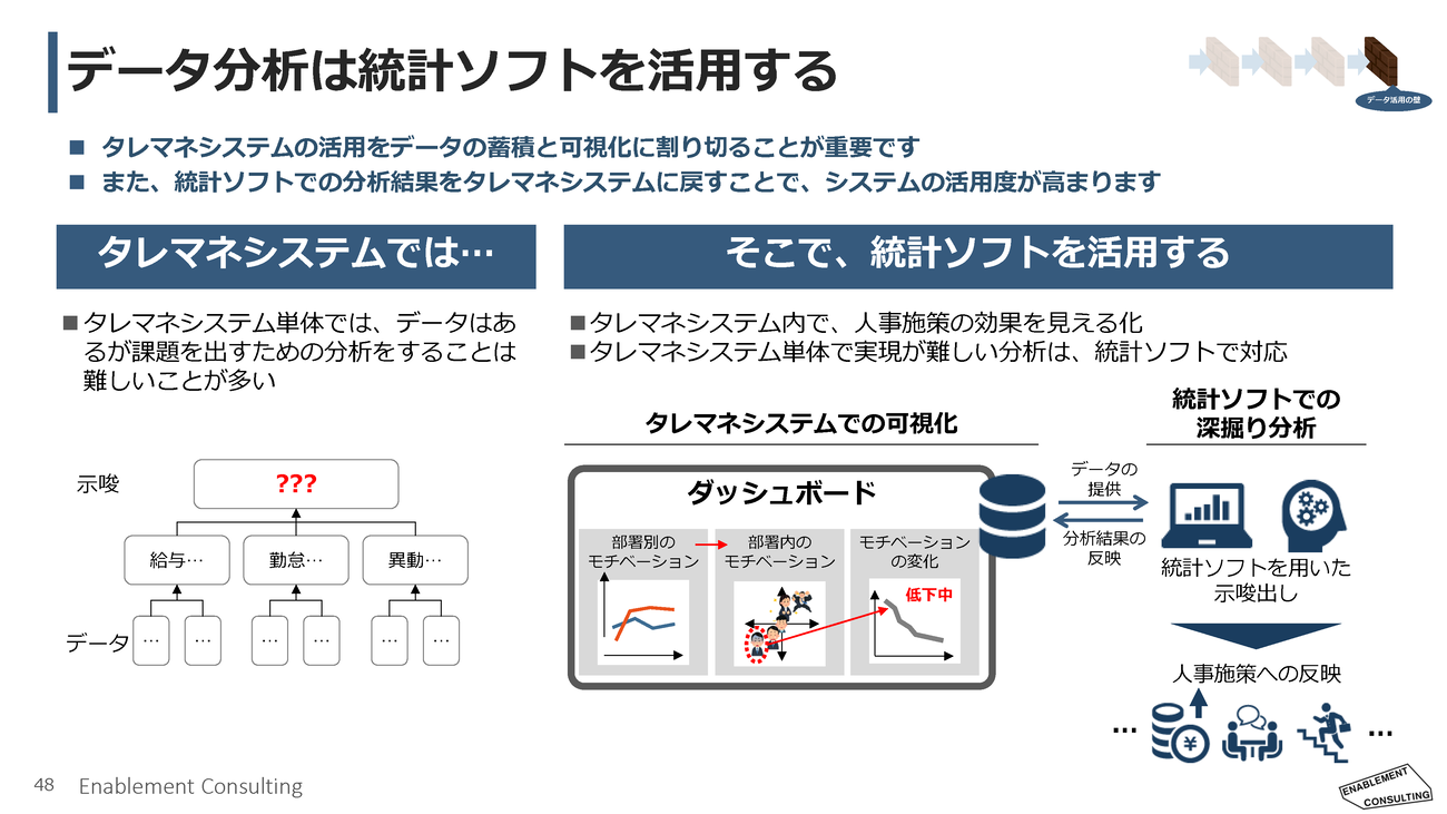 最後が、データ活用の壁となる。「タレントマネジメントシステム単体では、意味のある分析結果が出ない」ケースがあり得る。その場合には、目的に応じてタレントマネジメントシステムからデータを抽出し、統計ソフトを活用して分析することを勧めている。統計ソフトでの分析結果をシステム側に戻すことで、システムの活用度が高まるいう。