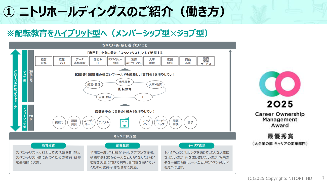 こうしたハイブリッド型での働き方は2024年から本格的にスタートしたばかりだが、2025年度の「キャリアオーナーシップ経営AWARD」において、キャリアの変革部門で最優秀賞(大企業の部)を受賞するなど、大きな注目を浴びている。仕事を通して数多くのことを経験し、成長していきたいと思っている人々には魅力のある働き方といえるだろう。