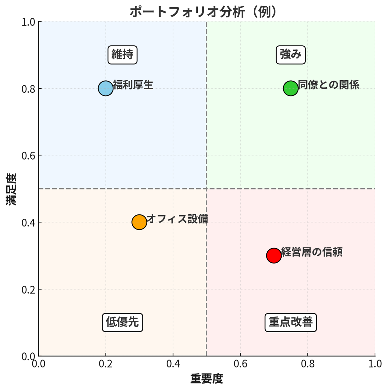 そこで役立つのが「ポートフォリオ分析」です。縦軸にサーベイのスコア(満足度)、横軸に重要度を置き、各項目をマトリクスにプロットします。