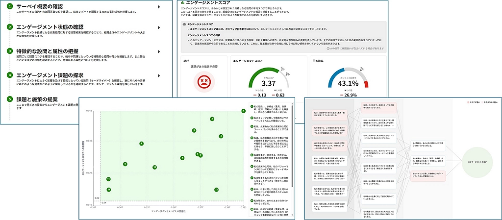 具体的には、エンゲージメントスコア、エンゲージメントに影響を与える項目・設問ごとのスコア、エンゲージメントに効く要素(キードライバー)の特定、エンゲージメントへの因果関係などを分析し、分析結果から課題を特定、それらに基づき施策案を提示する。これらはすべてWeb上で閲覧することが可能。将来的には、自由記述の設問への回答をAIが読み解く分析、エンゲージメントの高さに応じた回答傾向の分析などが可能になるように機能を拡充していく予定だという。