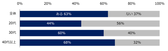 これまで職場でハラスメントを受けたことがあるか質問すると、63%が「ある」と回答した。年代別で見ると、「40代以上」が68%と「20代」の44%より24ポイント高く、年代が高い方ほどハラスメントを受けた経験があることが分かった。