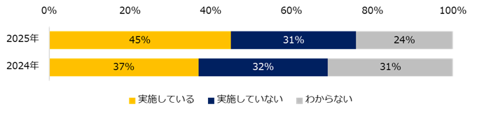 職場のハラスメント対策は45%が「実施している」と回答。2024年の同調査と比較して8ポイント上昇した一方、依然として約3社に1社は「実施していない」という実態が明らかになった。