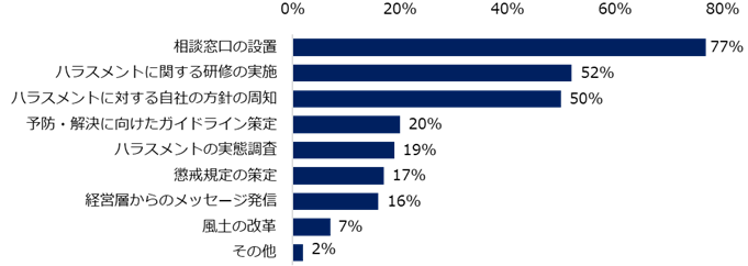 「実施している」と回答した人に具体的な取り組みを聞くと、「相談窓口の設置」が77%、「ハラスメントに関する研修の実施」が52%、「ハラスメントに対する自社の方針の周知」が50%と続いた。