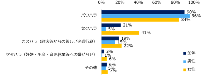 男女別で見ると、男性は「パワハラ」と回答した人が女性と比較して12ポイント高く(男性:96%、女性:84%)、女性は「セクハラ」と回答した人が男性と比較して36ポイント高い結果となった(男性:5%、女性:41%)。