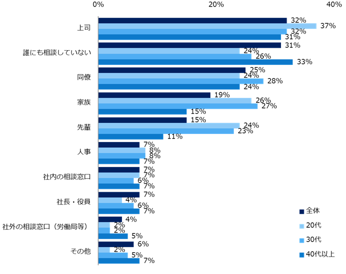 職場でハラスメントを受けた際、誰かに相談したか聞いたところ、「上司」が32%、「誰にも相談していない」が31%、「同僚」が25%と続いた。年代別では、「誰にも相談していない」で9ポイントの差(20代:24%、40代以上:33%)、「家族」で11ポイントの差(20代:26%、40代以上:15%)、「先輩」で13ポイントの差(20代:24%、40代以上:11%)があった。