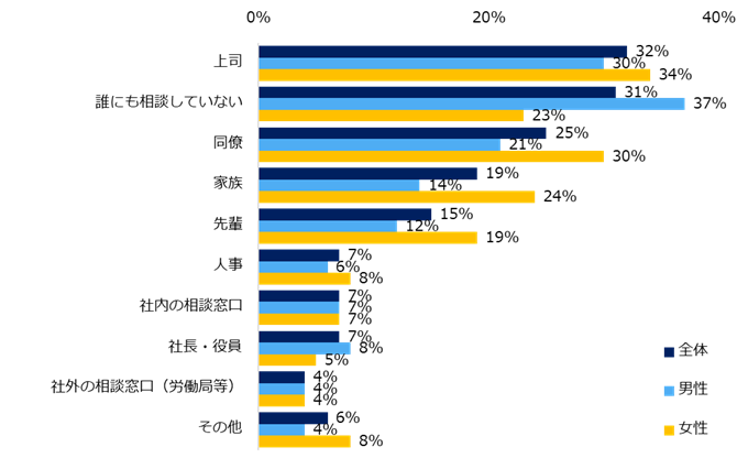 男女別で見ると、10ポイント以上差が開いたのは「誰にも相談していない」(男性:37%、女性23%)、「家族」(男性:14%、女性:24%)だった。