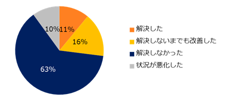 続いて、相談先を「上司、同僚、家族、先輩、人事、社内の相談窓口、社長・役員、社外の相談窓口(労働局など)」のいずれかと回答した人に、相談した結果について聞いた。「解決した」「解決しないまでも改善した」と回答した人は27%にとどまった一方で、「解決しなかった」「状況が悪化した」を合わせると73%に上り、状況が好転しないケースが多数を占める結果となった。
