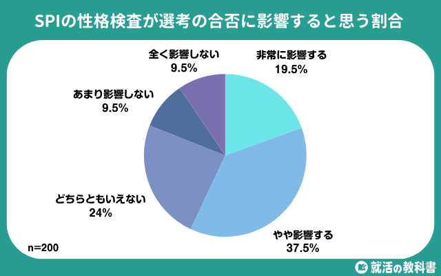 SPIの性格検査が選考の合否に影響すると思う割合について、「非常に影響する」が19.5%、「やや影響する」が37.5%とあわせて約6割となった。