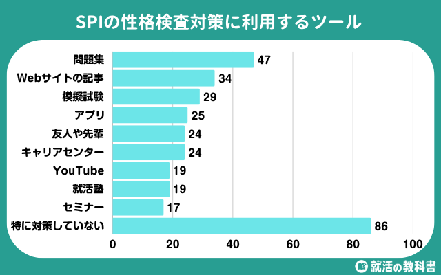 SPIの性格検査対策に利用するツールは、「問題集」が47人で最も多くなった。また、「特に対策していない」と回答した学生も86人と大きな割合を占め、約4割の学生がSPIの性格検査対策に積極的ではない実態も明らかになった。