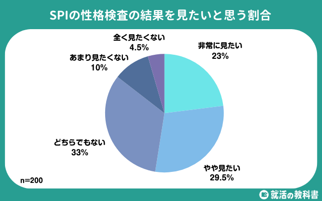 SPIの性格検査の結果について、「非常に見たい」が23.0%、「やや見たい」が29.5%と合計52.5%だった。半数の就活生が、性格検査の結果を「自己理解のツール」として活用したいと考えていると分かった。