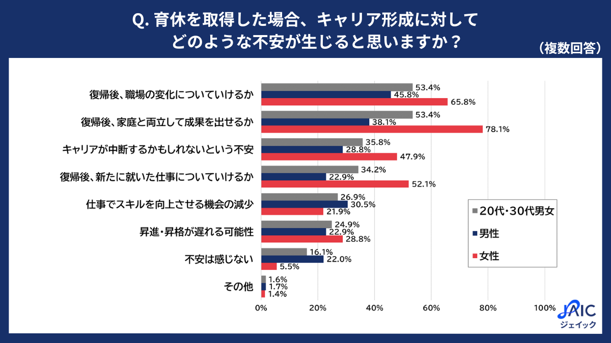 育休を取得した場合、キャリア形成に対してどのような不安が生じると思うか質問したところ、「復帰後、職場の変化についていけるか」「復帰後、家庭と両立して成果を出せるか」が同率53.4%、「キャリアが中断するかもしれないという不安」が35.8%、「復帰後、新たに就いた仕事についていけるか」が34.2%、「仕事でスキルを向上させる機会の減少」が26.9%、「昇進・昇格が遅れる可能性」が24.9%、「不安は感じない」が16.1%、「そのほか」が1.6%と続いた。