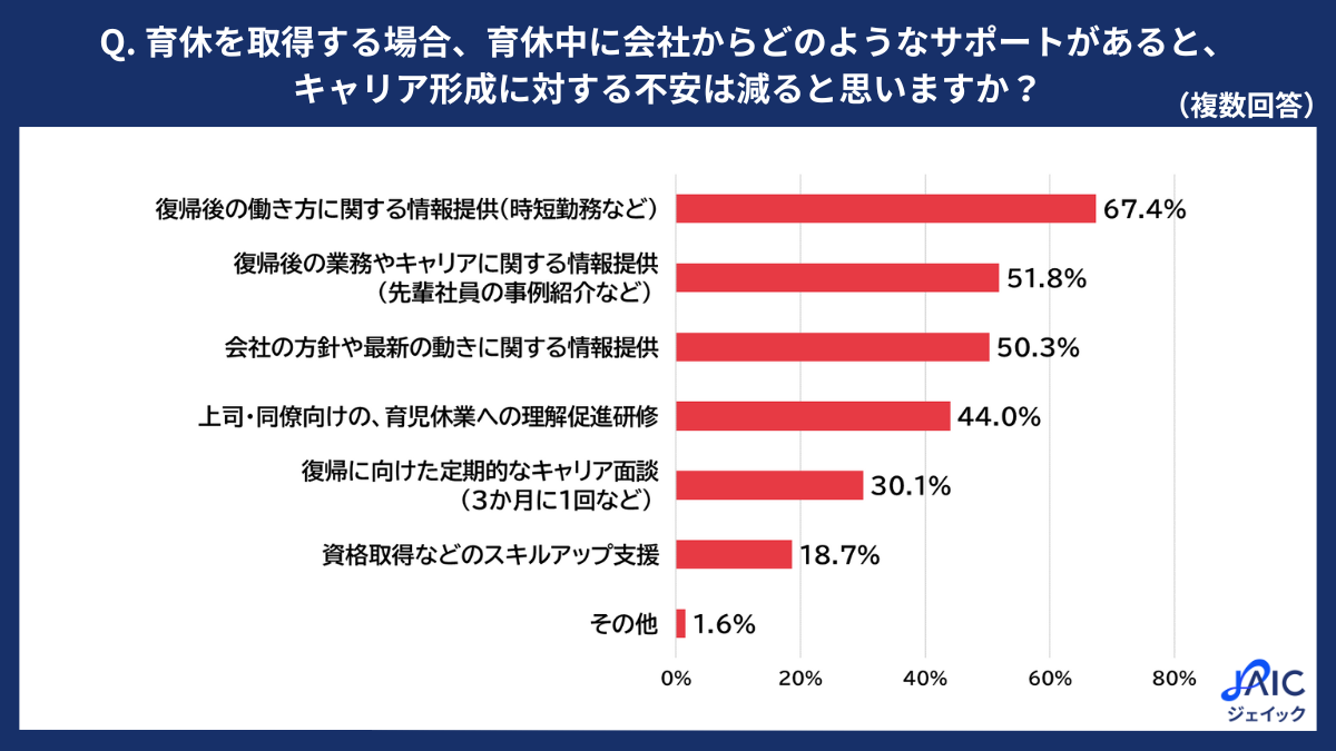 育休を取得する場合、育休中に会社からのどのようなサポートがあると、キャリア形成に対する不安は減ると思うか質問すると、「復帰後の働き方に関する情報提供(時短勤務など)」が67.4%、「復帰後の業務やキャリアに関する情報提供(先輩社員の事例紹介など)」が51.8%、「会社の方針や最新の動きに関する情報提供」が50.3%、「上司・同僚向けの、育児休業への理解促進研修」が44.0%、「復帰に向けた定期的なキャリア面談(3ヵ月に1回など)」が30.1%、「資格取得などのスキルアップ支援」が18.7%、「そのほか」が1.6%と続いた。