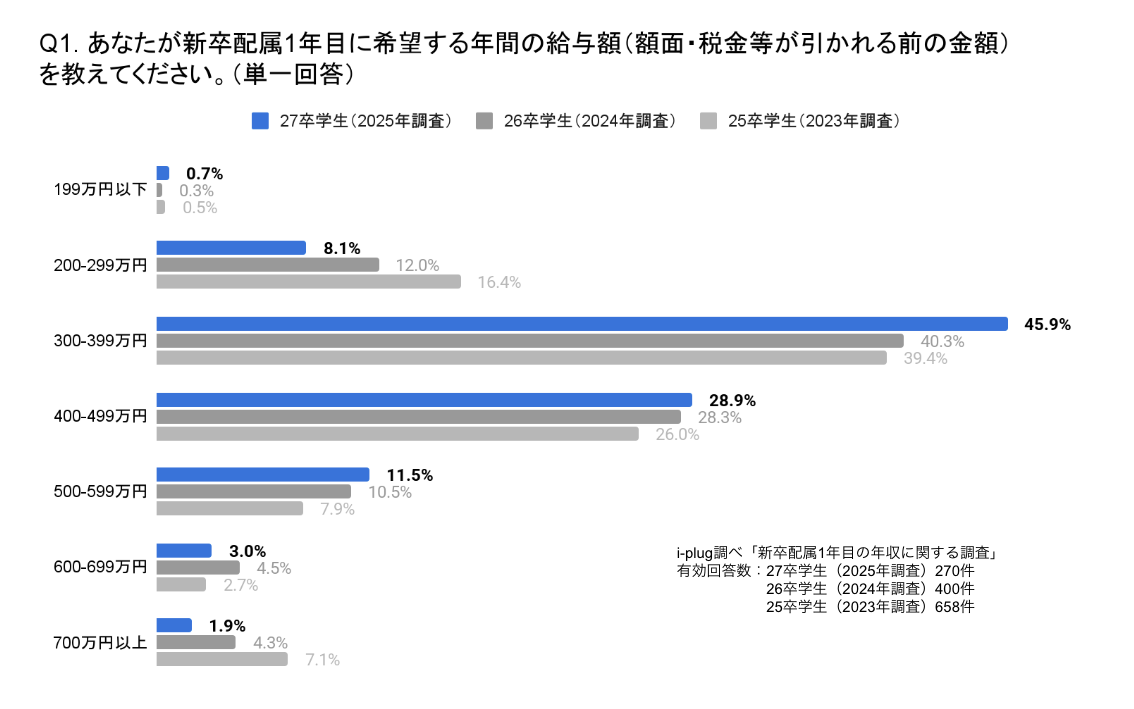 新卒1年目に希望する年収について、「300~399万円」と回答した学生が最多の45.9%。この年収帯は、過去3年間の調査を通じて3年連続で最多となった。