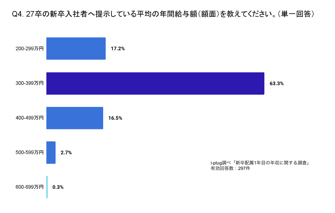企業に対し、27卒の新卒入社者へ提示している平均の年間給与額(額面)を聞いたところ、「300-399万円」が63.3%で最も多い結果となった。一方で「500万円以上」を希望する26卒学生は全体の16.4%だったが、「500万円以上」と回答した企業はわずか3.0%だった。