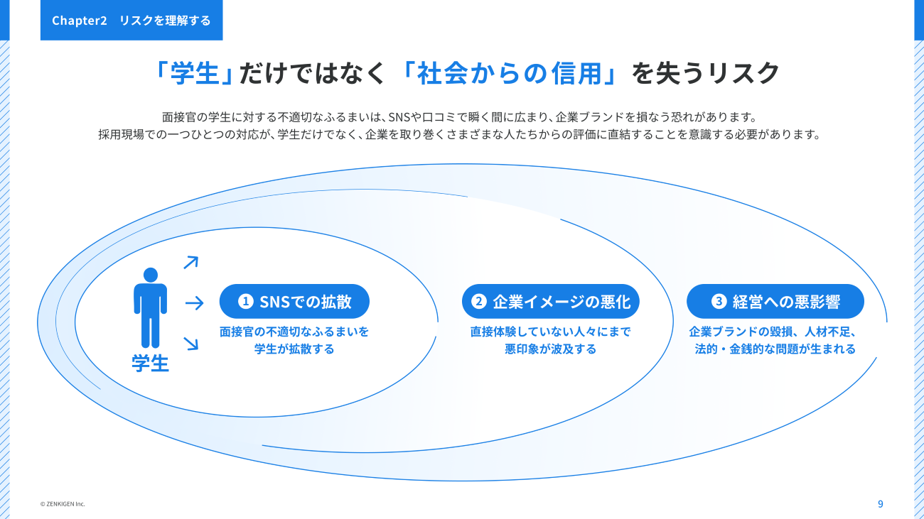 就活ハラスメント(以下、就ハラ)は採用活動の範囲を超え、企業経営全体に深刻な影響を与えるという。同ガイドでは、学生によるSNSでの拡散から始まり、直接体験していない社会全体への企業イメージ悪化、そして企業ブランドの毀損、人材不足、法的・金銭的な問題へと連鎖的に発展するリスクの全体像を、具体的な事例とともに解説している。