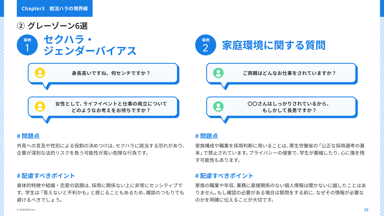 就ハラの判定基準は「面接官の意図」ではなく、「学生の受け止め方」にあるという。同ガイドでは、面接官が悪意なく発した言葉でも、学生が不快に感じれば就ハラとなる可能性があることを解説。セクハラ・ジェンダーバイアス、家庭環境に関する質問など、注意が必要な場面をグレーゾーン6選として具体例とともに紹介し、配慮すべきポイントを明示している。