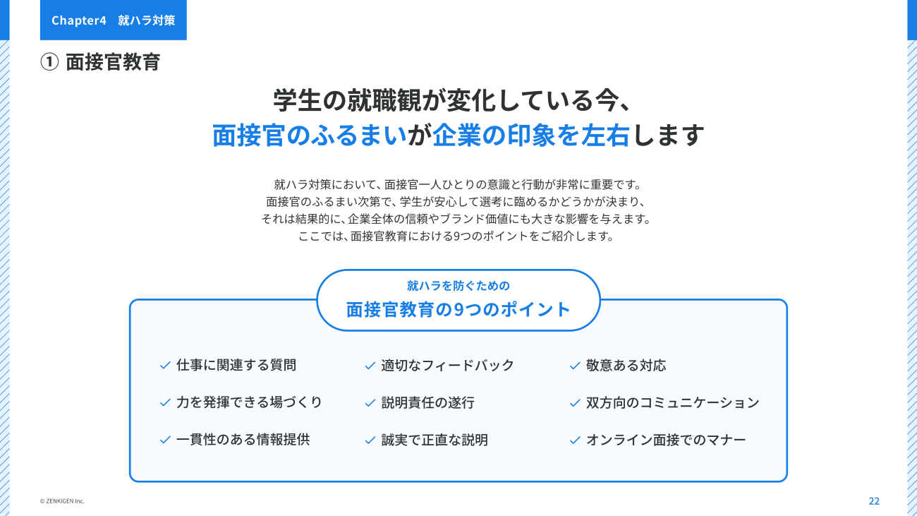 現代の学生の就職観の変化を踏まえ、面接官の適切なふるまいのポイントをまとめて解説。仕事に関連する質問をする、双方向コミュニケーションを意識する、敬意ある対応を行うなど、面接官研修で活用できる実践的な内容だとしている。
