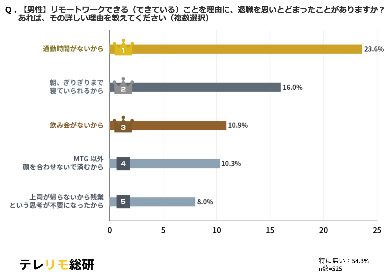 対して男性は、「上司が帰らないから残業という思考が不要になった」と答えた人が多く、業務効率向上や拘束感の緩和を重視していることが分かる。