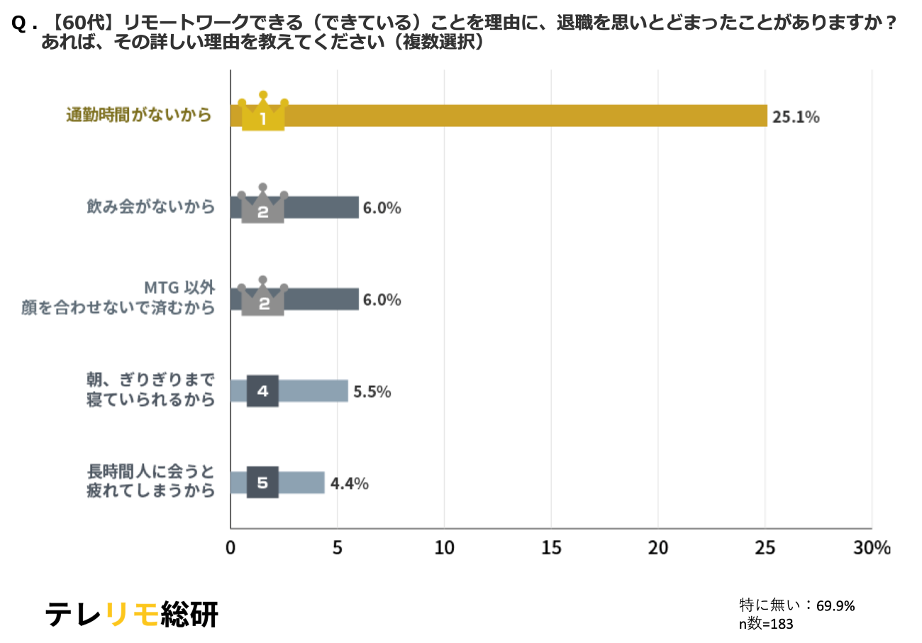 LASSICは、同社が運営する「テレワーク・リモートワーク総合研究所」にて、「リモートワークによって退職を思いとどまった理由」に関するアンケート調査を実施した。