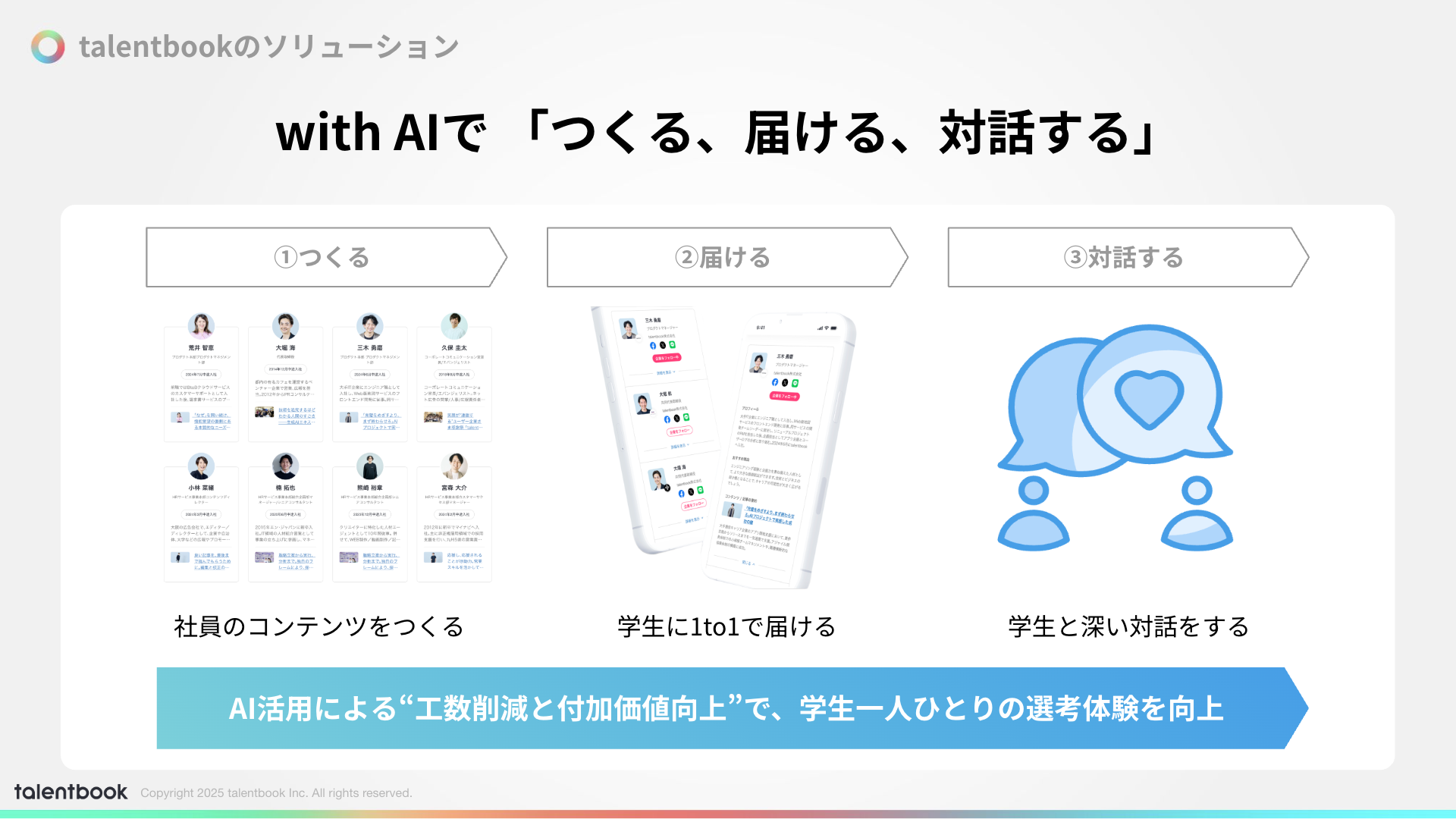 talentbookは、with AIで学生1人ひとりの選考体験を向上する、新卒採用向けソリューションサービスの本格提供を開始した。