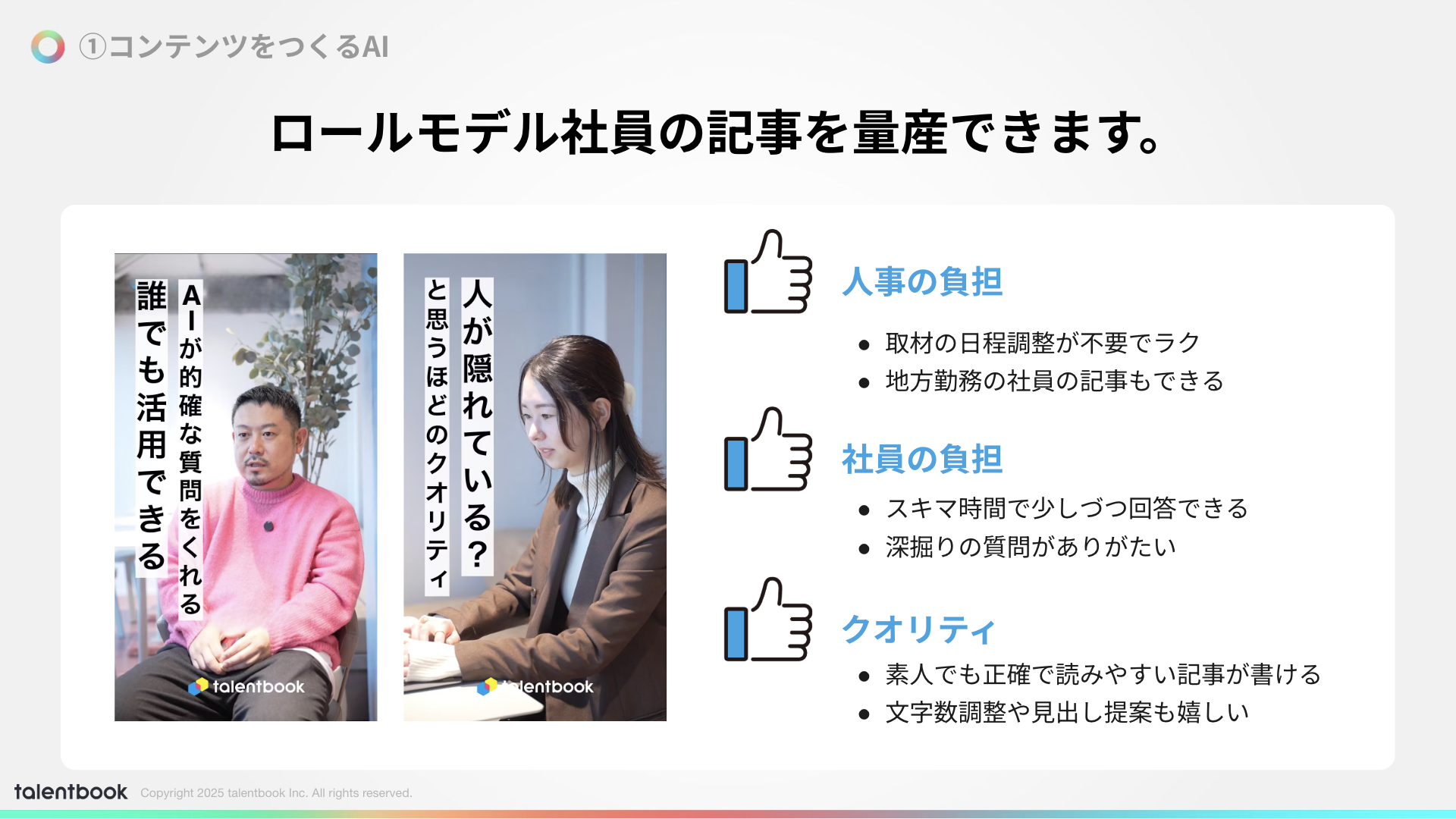 AIが、社員インタビューから高品質な記事を自動生成する。制作期間を短縮し、低コストで大量のロールモデルコンテンツを量産できるという。取材の日程調整が不要で、地方勤務の社員の記事も簡単に作成でき、社員はスキマ時間で回答するのみ。記事制作の経験がない人でも、正確で読みやすい記事が書けるとしている。
