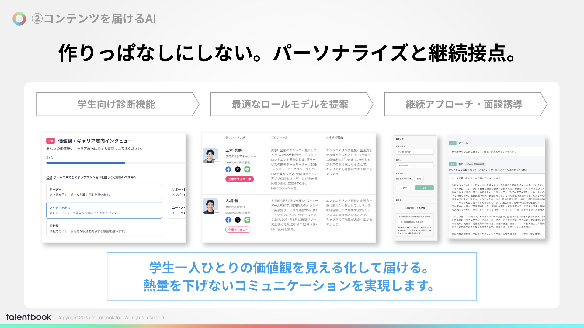 学生向け診断機能で、経験・価値観をAIが分析し、相性の良いロールモデル社員を提案する。コンテンツを作ったままにせず、適切な学生に適切なタイミングで最適な情報を届けられるという。ターゲット学生へ継続アプローチ・面談誘導を行い、熱量を下げないコミュニケーションで有効応募を強化するとのことだ。