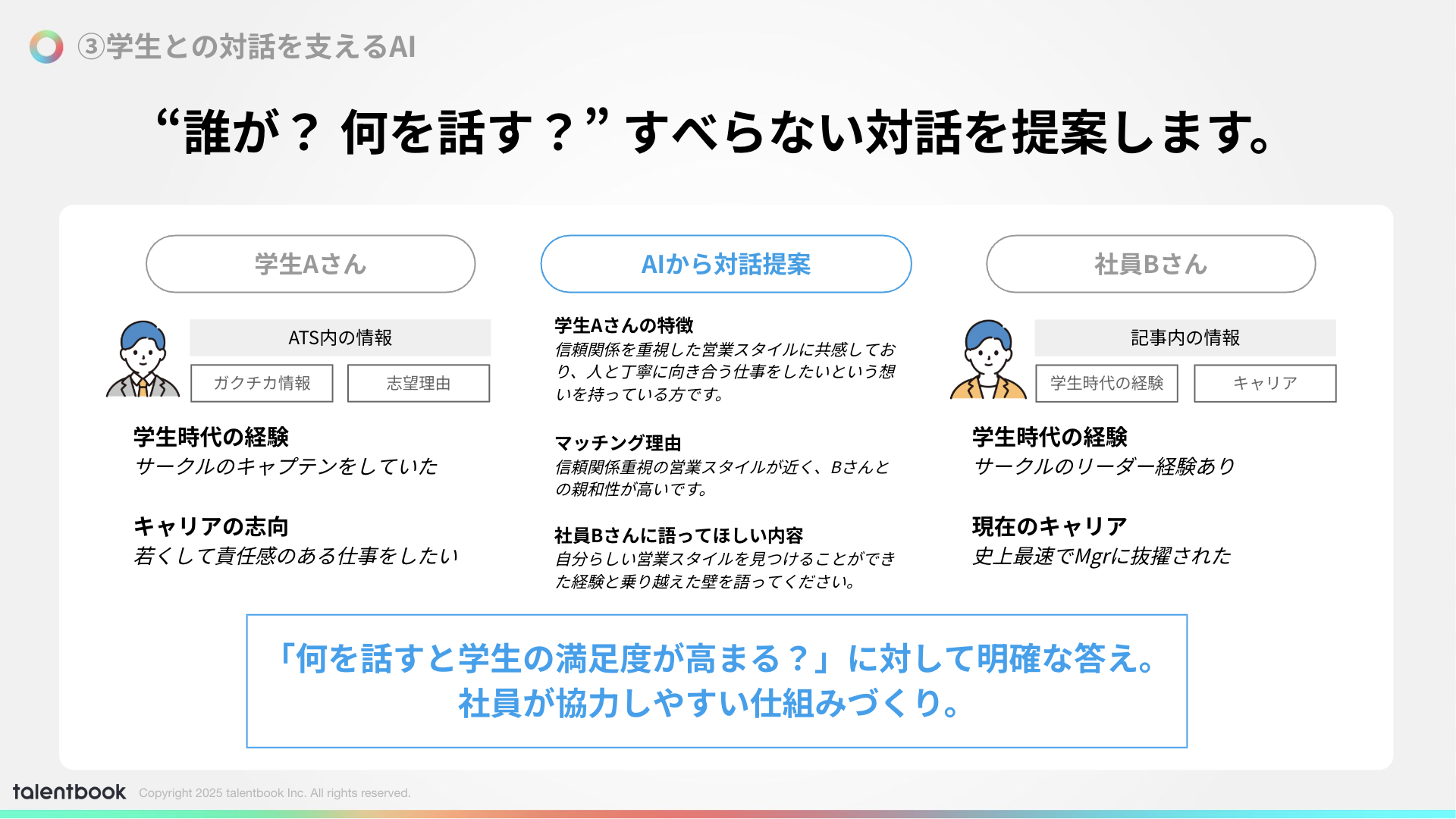 さらに、不安払拭・共感を生む対話内容を具体的に提案することで、「何を話すと学生の満足度が高まるか」に対して答えを提供。ロールモデル社員が協力しやすい仕組みをつくり、全社巻き込み採用を実現するという。
