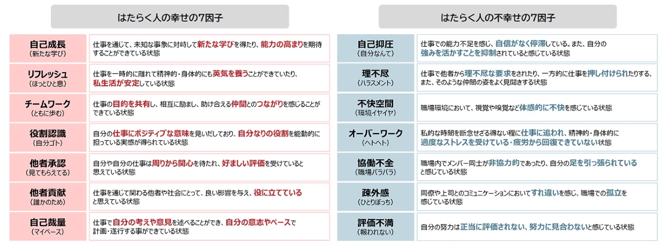 同調査における、働くことを通じて感じる幸福感や不幸感の要因は、それぞれ7つの因子で構成され次のように定義。7つの因子の状態を良好に保つことによって、職業生活ウェルビーイングを高められる。