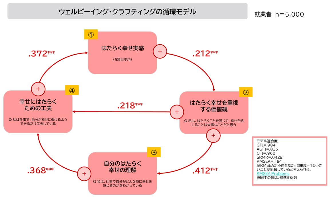 価値観醸成、幸せの源泉の理解が深まることで「幸せに働くための工夫(クラフティング)」が促進され、その結果さらなる「働く幸せ実感」が獲得される。すなわち、持続的な職業生活ウェルビーイングの実現には、日常の仕事の中で実際に働く幸せを実感することが重要だという。