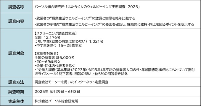 同調査は、就業者の「職業生活ウェルビーイング」の認識と実態(経年変化)を把握するとともに、その要因を明らかにし、継続的な維持・向上のためのポイントを提示することを目的としている。職業生活ウェルビーイングとは、自分の仕事に満足し、働くことを通じて、社会とのつながりや貢献、喜びや楽しみを感じることが多く、怒りや悲しみといった嫌な感情をあまり感じずにいる状態。また、そのような仕事や働き方を自分で決めることができている状態のこと。