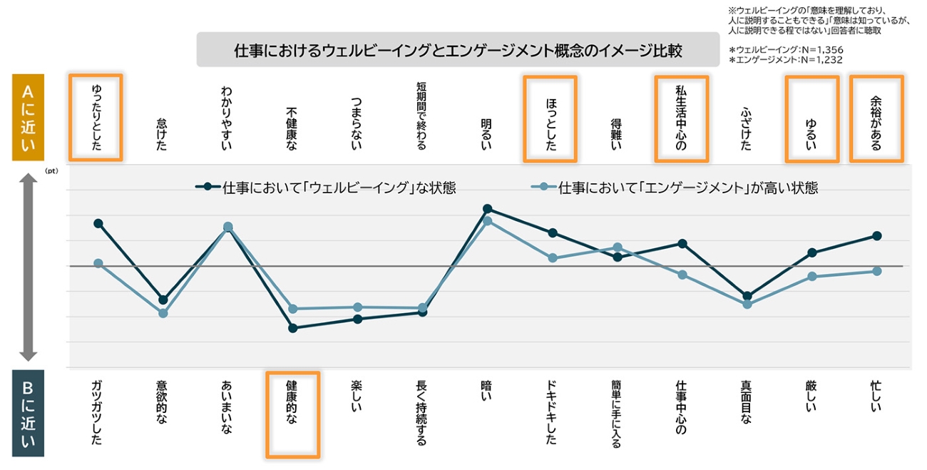 働くうえでの「ウェルビーイング」と近似する概念として「エンゲージメント」と比較した。結果、エンゲージメントもウェルビーイングも仕事に対して「意欲的」で「継続的」で「真面目な」イメージが共通していた。