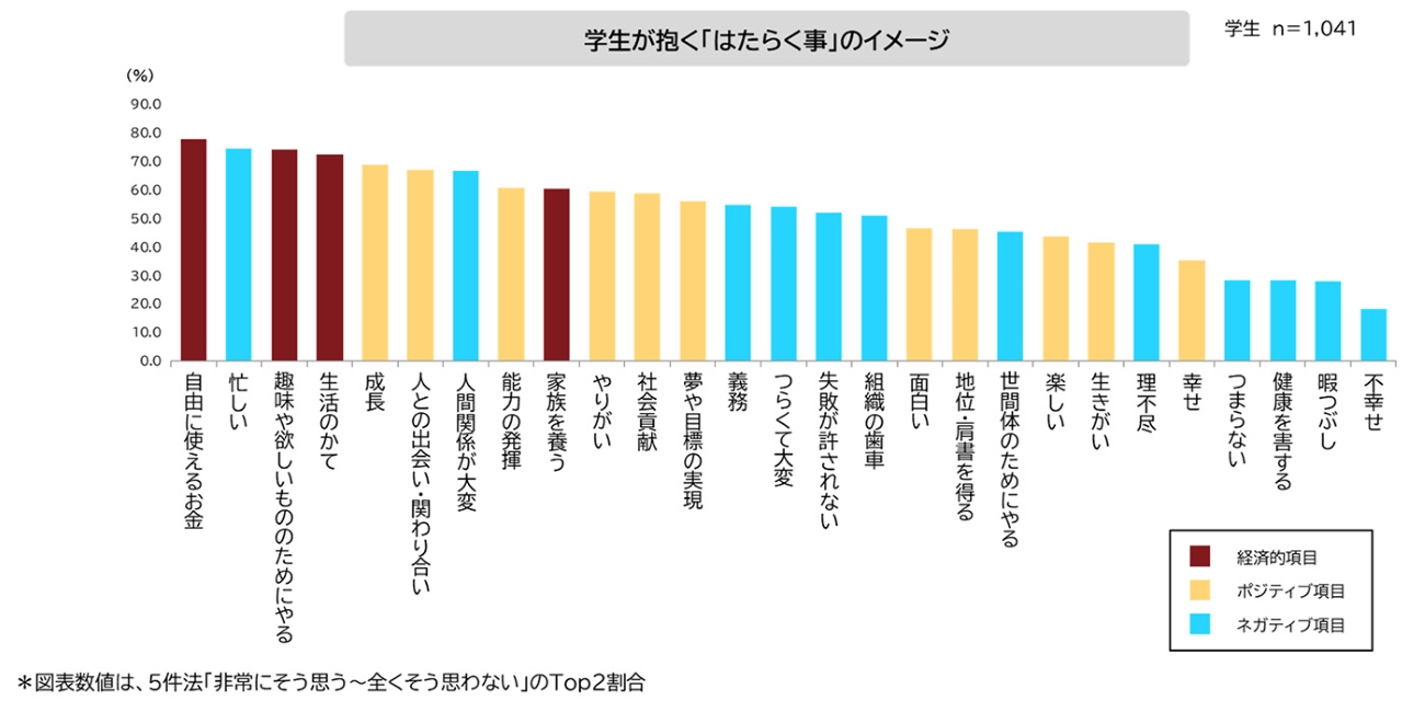 学生に対し、働くことに関連付けられる複数の言葉(ポジティブ/ネガティブ)を提示し、働くことのイメージを確認した。学生は、「自由に使えるお金」「趣味や欲しいもののため」といった経済的側面が上位となり、「忙しい」「人間関係が大変」といったネガティブな懸念も上位に上がる。