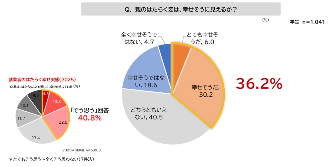 学生(高校生~大学院生)に対し、親の働く姿(働いていて幸せそうに見えるか)について印象を確認した。全体の36.2%は「幸せそうだ」と回答したものの、23.3%は「幸せそうではない」と回答した。この傾向は、就業者自身が感じている主観的幸福感(40.8%)と近似しており、親世代の働き方や職業生活実態が、家庭生活を通じて子どもにも伝わっている可能性が示唆される。