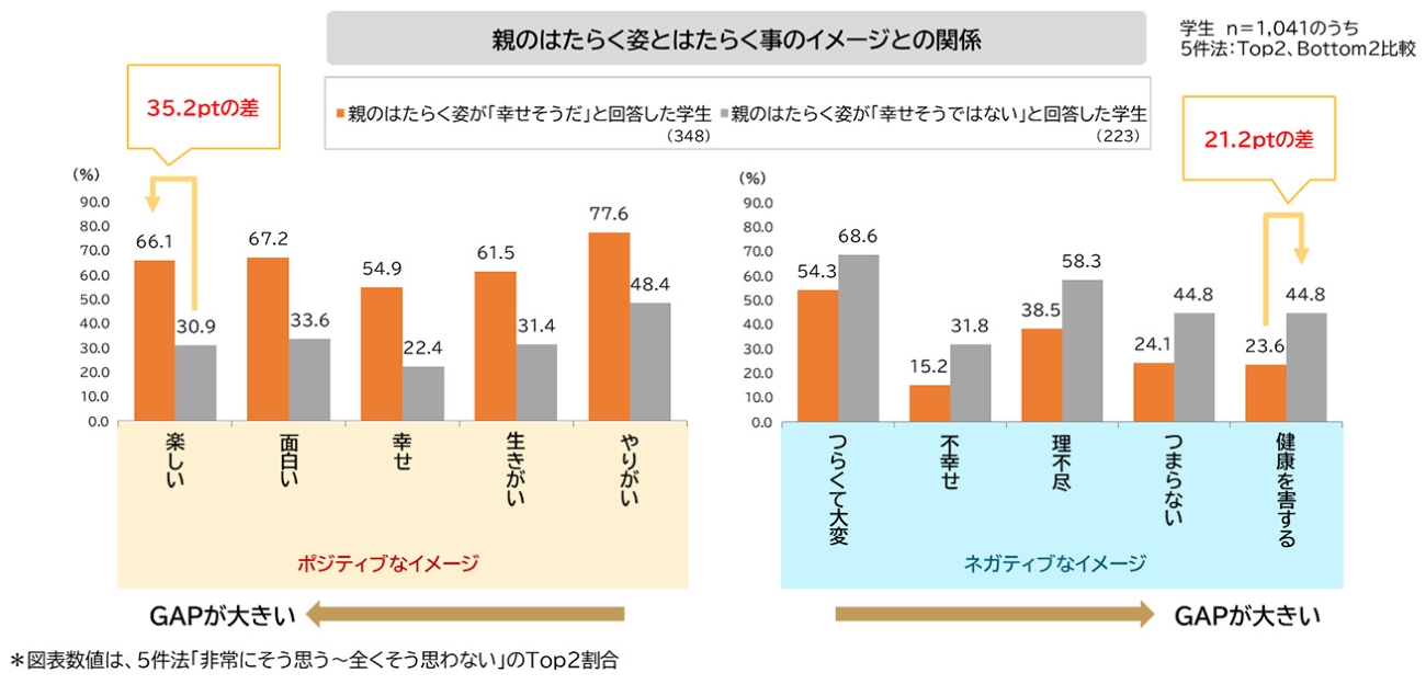 同分析は相関であり因果関係ではないものの、中でも「楽しい」は35.2ポイントの差が生じており、家庭内での親(就業者)の働く姿の印象が、子どもの労働観やキャリア観の形成に影響する可能性が示唆される。