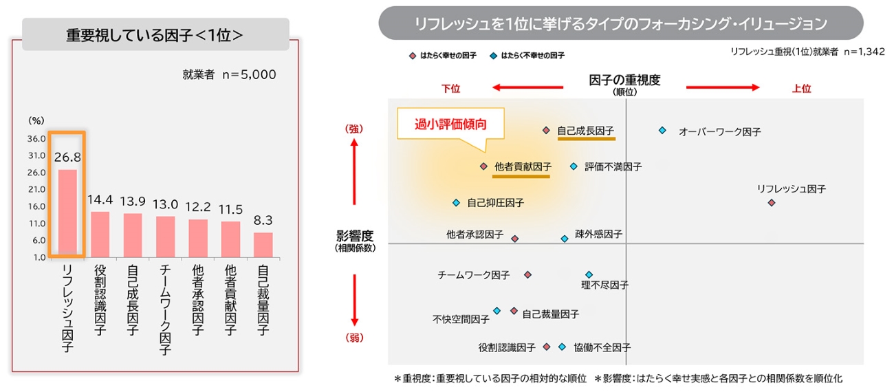 就業者の相対的な重視度では「リフレッシュ因子」は3位となった。しかし、順位づけで「リフレッシュ因子」を1位に挙げた人は最も多かった。リフレッシュ因子を1位に挙げる人は、フォーカシング・イリュージョンが生じている可能性がある。実際、リフレッシュ因子重視の人が次に重視するのは「オーバーワーク因子」であり、それ以外の因子は全体平均よりも低く位置付けられる。