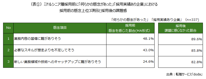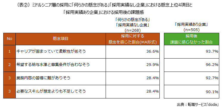 「何らかの懸念がある」と回答した人に具体的な懸念点を聞くと、上位4項目には「キャリアが固まっていて柔軟性が低そう」「希望する給与水準と募集条件が合わなそう」、同率で「業務内容の習得に難がありそう」「必要なスキルが想定よりも不足していそう」が挙げられた。しかし、「採用実績あり企業」では、上記4項目について、9割以上が採用後「課題に感じなかった」と回答している。