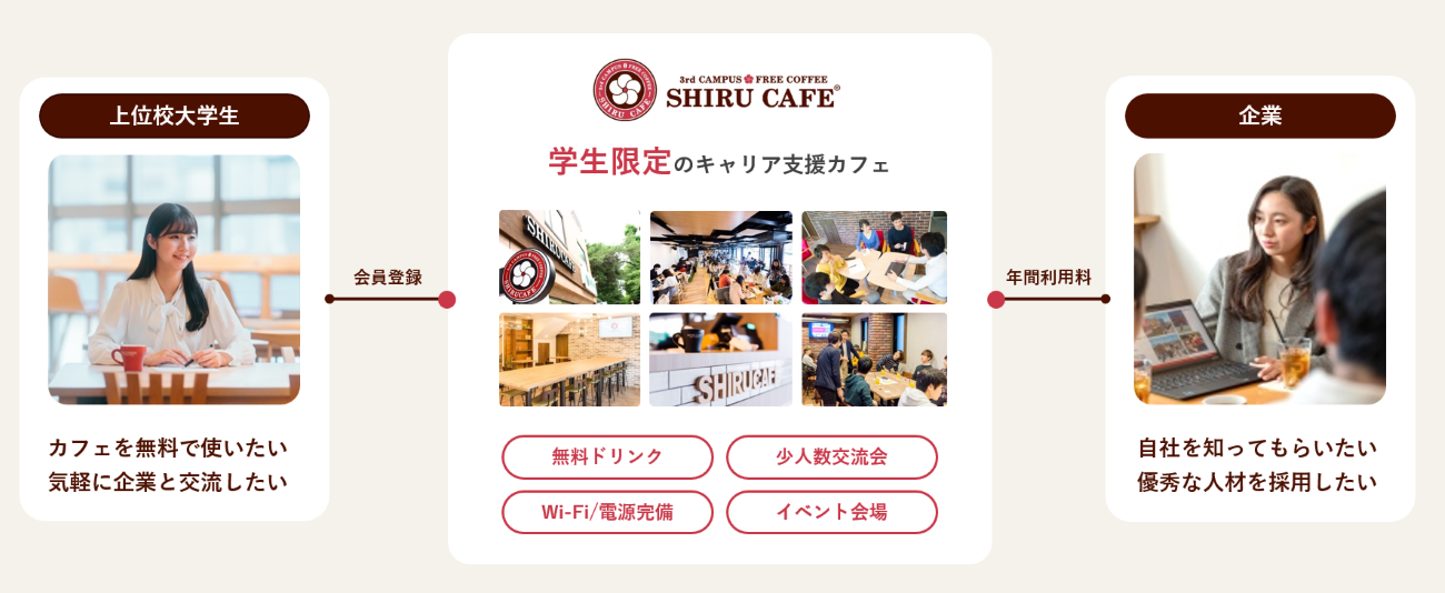 知るカフェとは、東京大学、京都大学、早稲田大学、慶應義塾大学をはじめ、全国大学内外で20店舗展開する学生限定のキャリア支援カフェ。就活生だけでなく大学1~2年生の若年層のキャリアも支援している。企業と学生のオフラインの採用プラットフォームとして運営し、企業と学生とのつながりを創出している。店内では、学生に対してドリンクに加え、企業と交流できる機会を提供し、企業にはカフェでのMeetup、会場利用、席利用、広告掲載などブランディングにも活用されている。