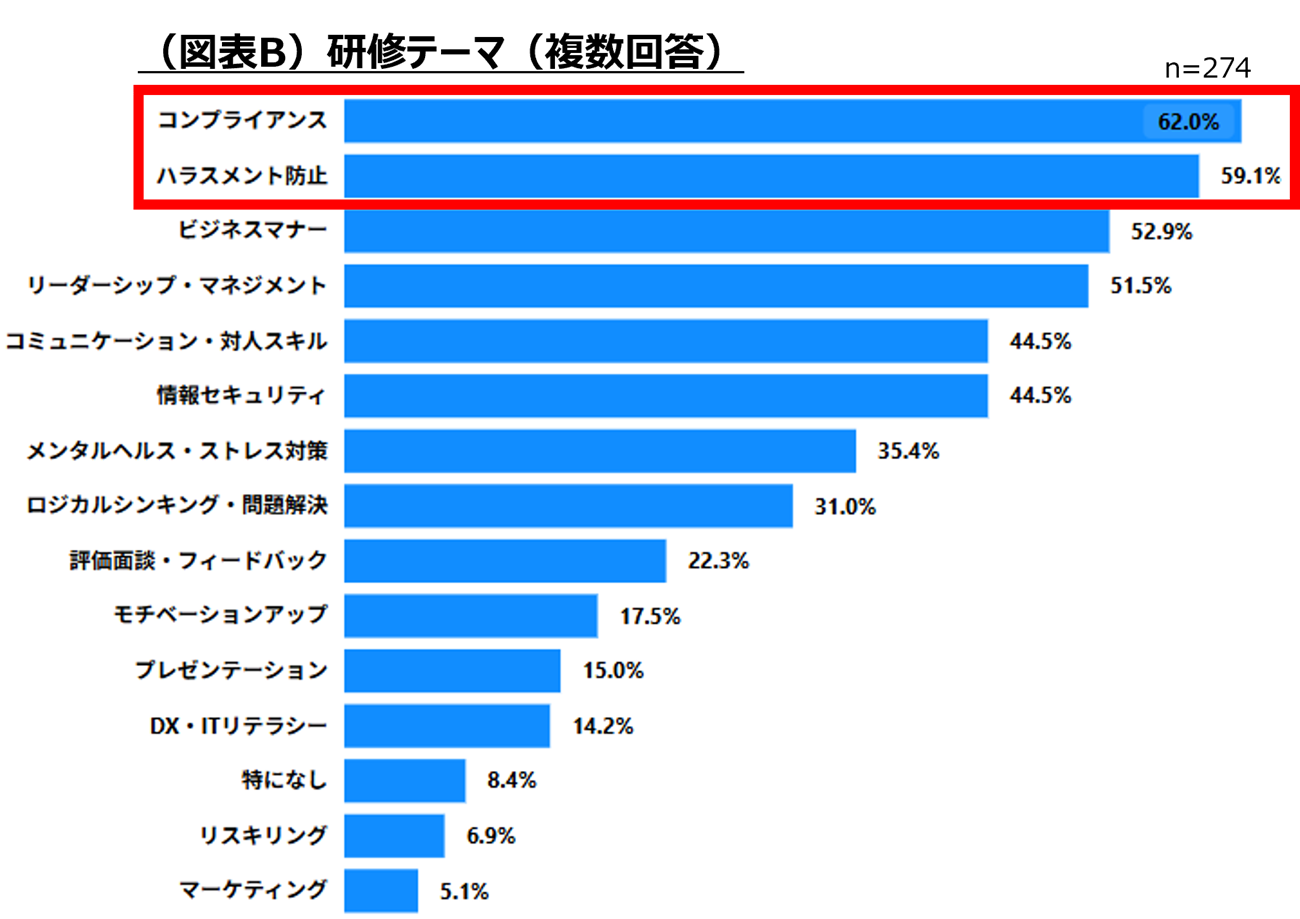 研修実施テーマはコンプライアンス、ハラスメント防止など「守り」の分野が上位