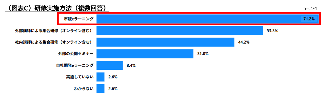 研修方法は「市販のeラーニング」が71.2%で最も多く、「自社開発eラーニング」は8.4%と少数だった。