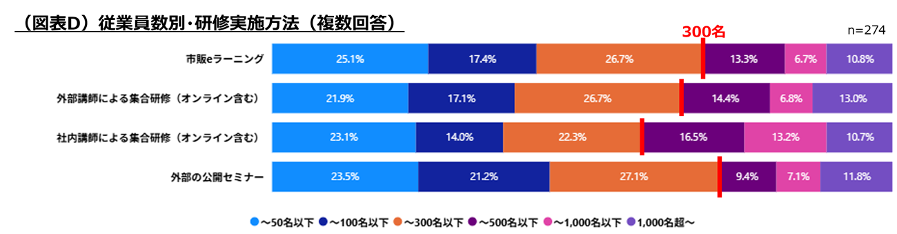 上位4項目を従業員数別で見ると、300名以下の企業では「外部の公開セミナー」、301名以上では、オンラインを含む「外部講師・社内講師による集合研修」が多く採用される傾向が見られた。