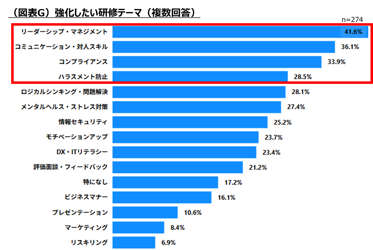 今後強化したい研修テーマとして、「リーダーシップ・マネジメント」が41.6%、「コミュニケーション・対人スキル」が36.1%、「コンプライアンス」が33.9%で上位となり、管理職・ミドル層育成不足の課題との関連が示されている。
