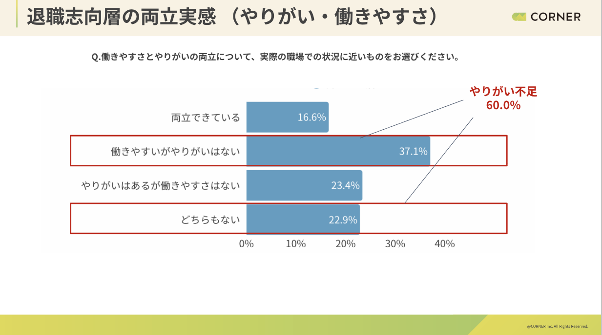 退職志向層の不満は処遇・昇進・裁量などやりがい側に偏っていたため、「働きやすさ」「やりがい」の両立実感を確認したところ、「両立できている」は16.6%にとどまった。「働きやすいがやりがいはない」「どちらもない」が60.0%のため、やりがい不足が浮き彫りになっている。