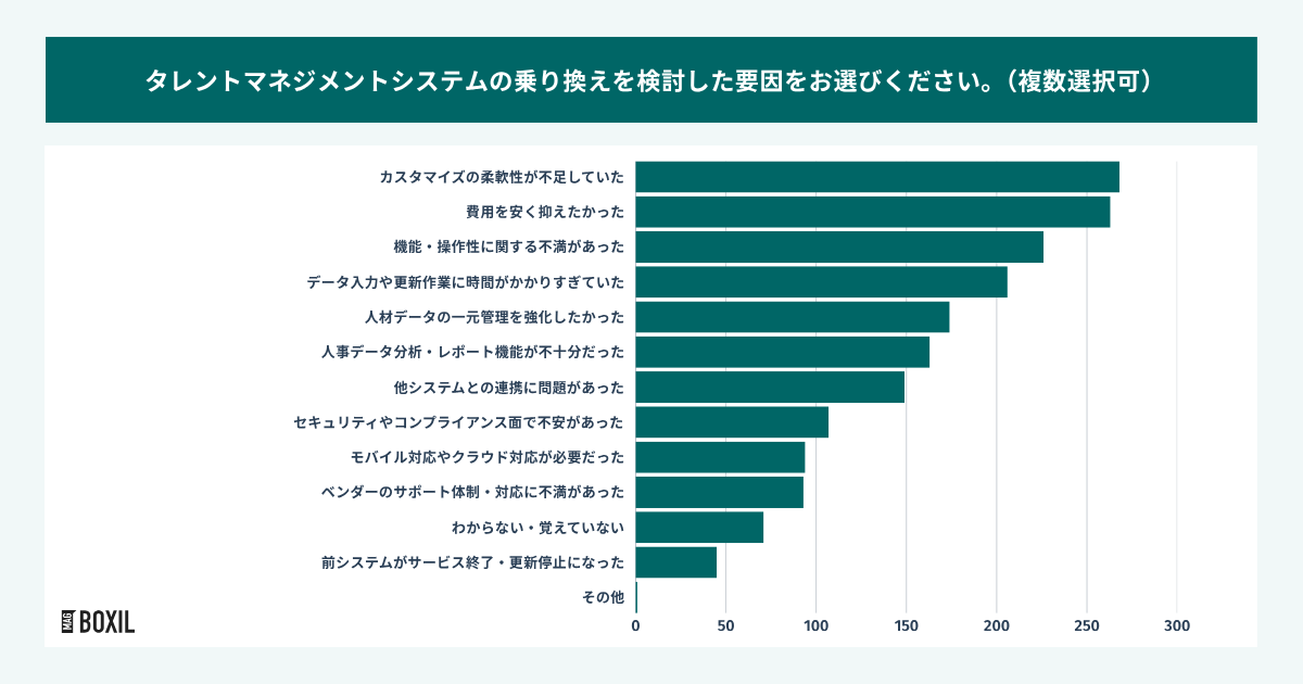 タレントマネジメントシステムの乗り換えの検討理由は「カスタマイズの柔軟性不足」